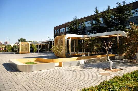 设计师设计了一个弯曲的、像过山车相同的带状结构,它被折叠成三维空间,构成了一系列与环境相结合的文化主题走廊:露天花园、遮阳亭和展示走廊。屋顶梁在某些当地向下弯曲,构成了幕墙和长凳,很好地诠释了不同功能区的接连性。整个建筑缠绕着树木,最大极限地保留了广场原有的树木,利用茂密的树冠构成一个暗影区域。